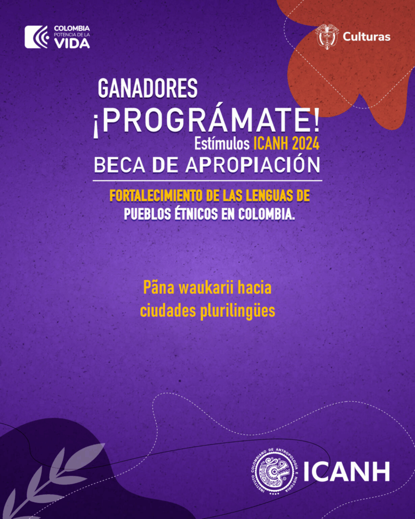 Pãna waukarii hacia ciudades plurilingües” es un proyecto del colectivo Raíces del Otún que tiene como objetivo promover el uso y reconocimiento de la lengua embera entre niños y jóvenes de comunidades de habla urbanas en las ciudades de Bogotá y Pereira, mediante procesos formativos a pedagogos, con enfoque intercultural, además de la intervención en el paisaje lingüístico de sectores públicos en ambas ciudades. Durante el 2024 ha realizado formación con aproximadamente 100 formadores de instituciones educativas públicas de Pereira y Bogotá, y actualmente se gestiona la instalación de señalética bilingüe embera en una IE de Bogotá y una franja del transporte público Megacable. Además se logró la impresión de 85 cartillas para el aprendizaje inicial de lengua emberá y su distribución gratuita a docentes y gestores culturales